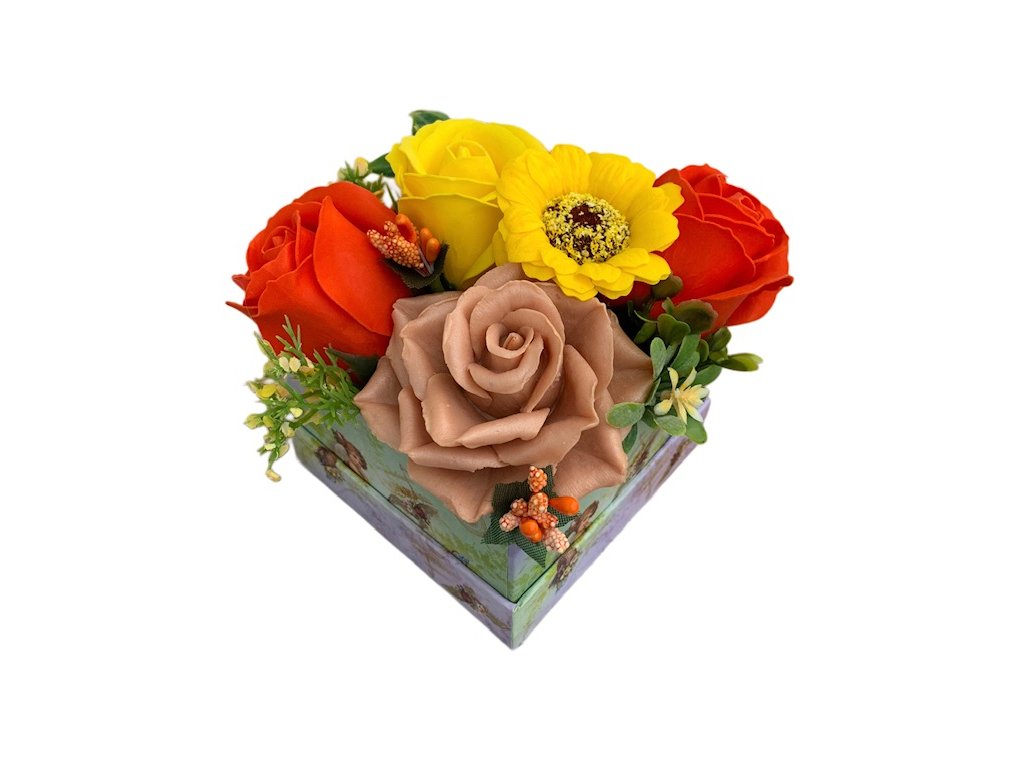 Suchen Sie ein kleines Geschenk mit großer Wirkung? Diese Seifen-Mini-Box ist eine elegante Dekoration und zugleich eine originelle Aufmerksamkeit zum Geburtstag, Namenstag, als Dankeschön oder einfach so. Die harmonisch abgestimmte Kombination aus Seifenblüten in warmen Frühlingsfarben (Orange- und Gelbtöne, ergänzt durch eine puderrosa Rose) sieht auf den ersten Blick wunderschön aus und bleibt dank des festen Arrangements lange als Dekoration erhalten.