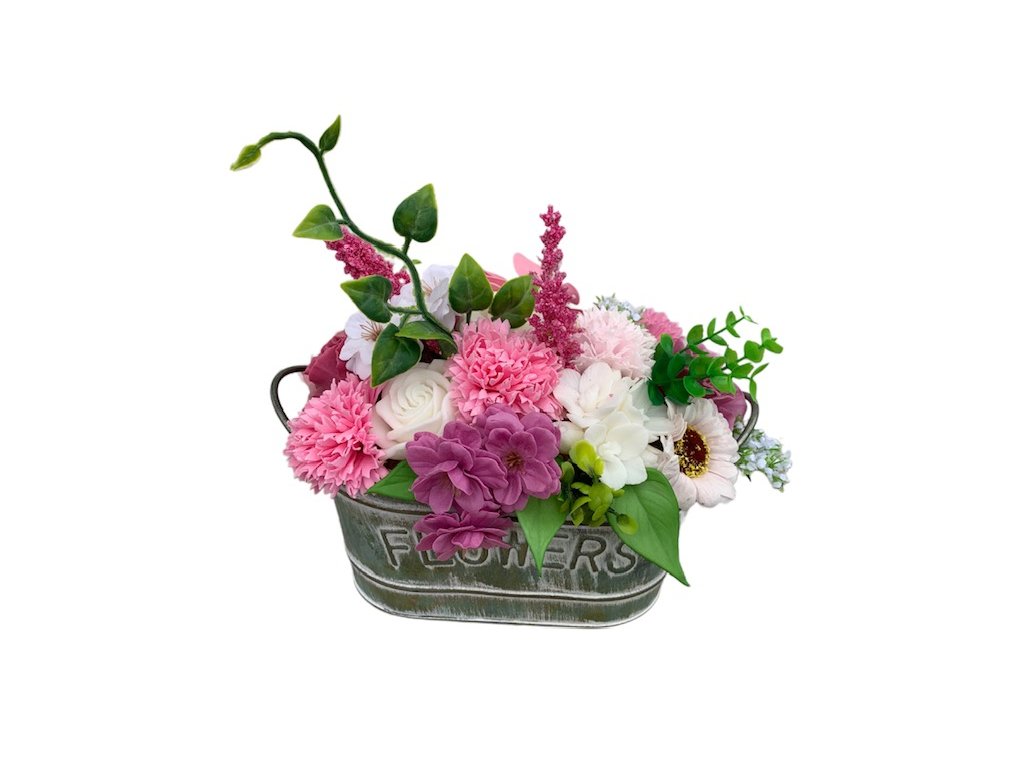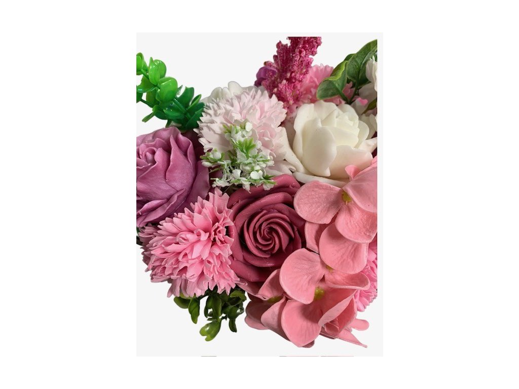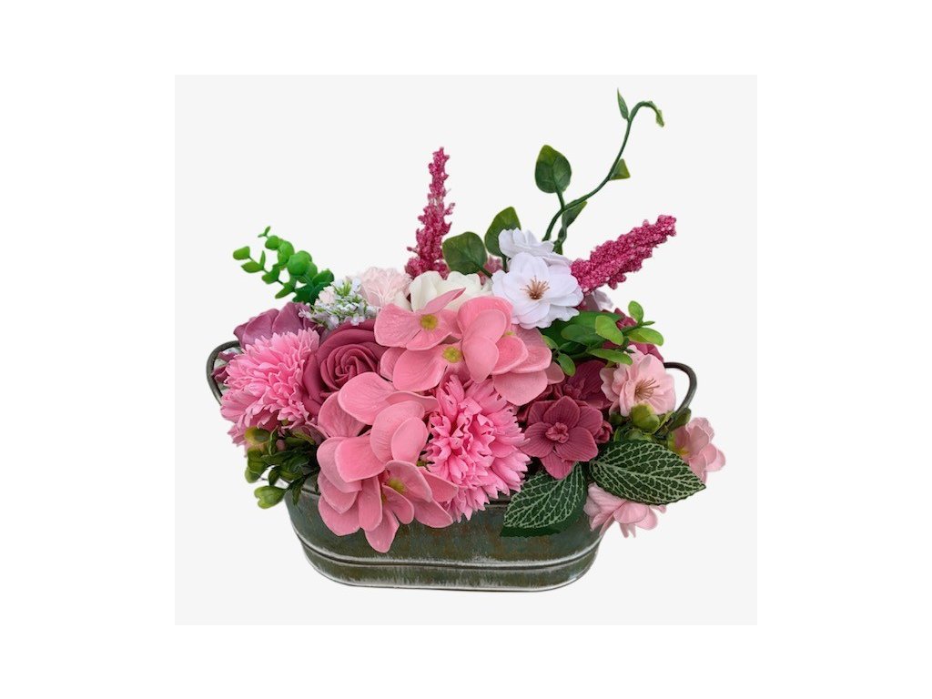 Der stilvolle Seifenblumenstrauß Jaruška ist ein romantisches, zart abgestimmtes Arrangement in Rosa-Violett- und Weißtönen, das jeden Raum sofort gemütlicher wirken lässt. Der Strauß ist in einem stabilen Metallbehälter im Vintage-Stil arrangiert – dadurch wirkt er sauber, standsicher und ist sofort dekorationsbereit: kein Gießen, kein Welken, keine Pflege.