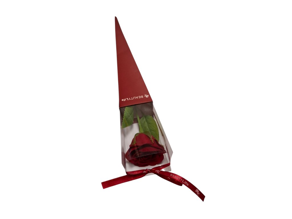 Die Seifenrosenblume, die nie verblüht. Auf einem Stiel mit Blütenblättern arrangiert und in einem Geschenkkarton präsentiert