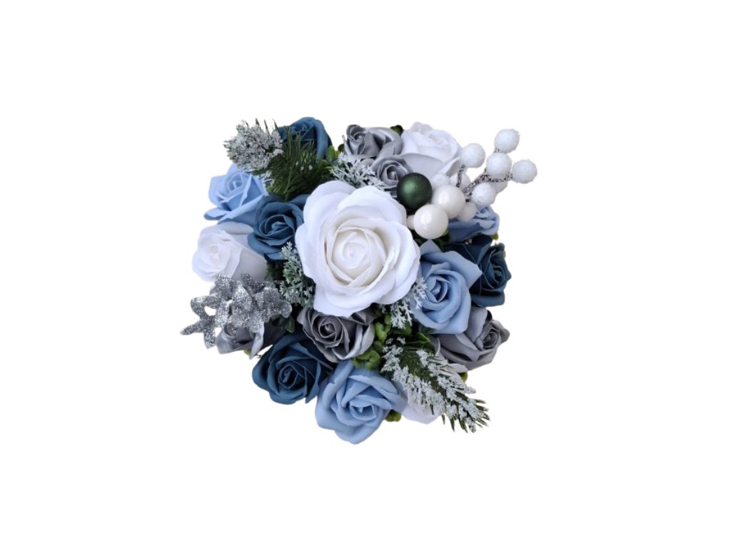 Dekorační kytice bílo-modro-stříbrná bude skvělým doplňkem Vašeho bytu, kanceláře nebo třeba vstupní haly. Je trvanlivá, hodí se výborně jako unisex dárek k narozeninám, svátku, výročí nebo svatbě.