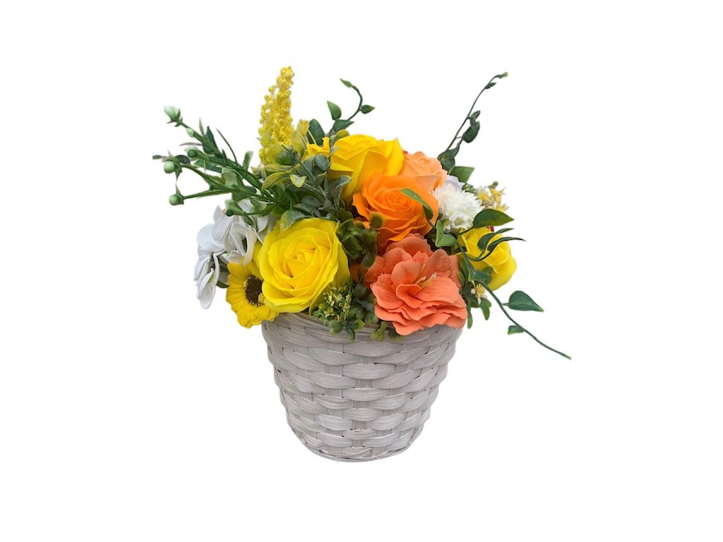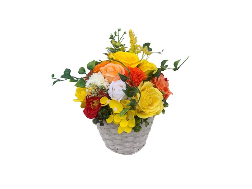 Elegantní Mýdlová kytice Jarní den v lýkovém květináči. Krásná a trvanlivá dekorace, ideální jako dárek pro ženu i muže.