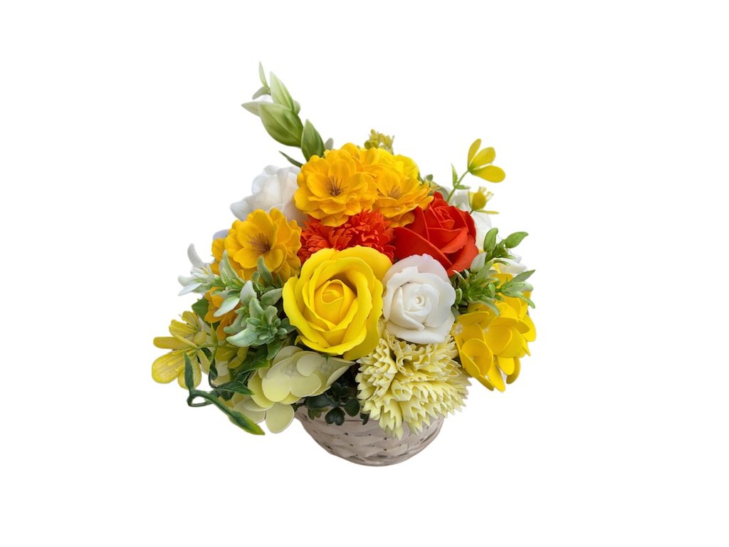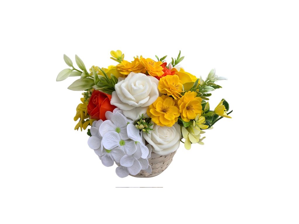 Rozjasněte den sobě nebo někomu blízkému. Mýdlová kytice Jarní květy je svěží aranžmá v teplých jarních tónech, které okamžitě oživí interiér a zároveň poslouží jako originální dárek. Kytice je aranžovaná v lýkovém květináči o průměru 14 cm a výšce 9 cm, takže působí čistě, kompaktně a je připravená rovnou k vystavení – bez údržby a bez vadnutí.