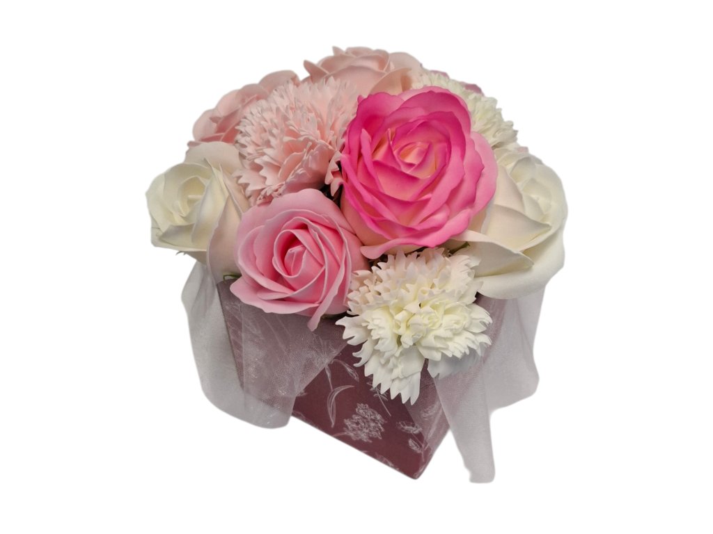 Mýdlová kytice Romantic II je krásná a elegantní dekorace z mýdlových květů, která potěší jako originální dárek i stylový doplněk interiéru. Kytice je pečlivě aranžována v kvalitním papírovém boxu a působí luxusním a romantickým dojmem.