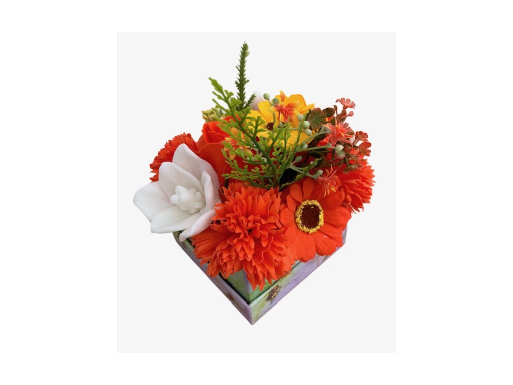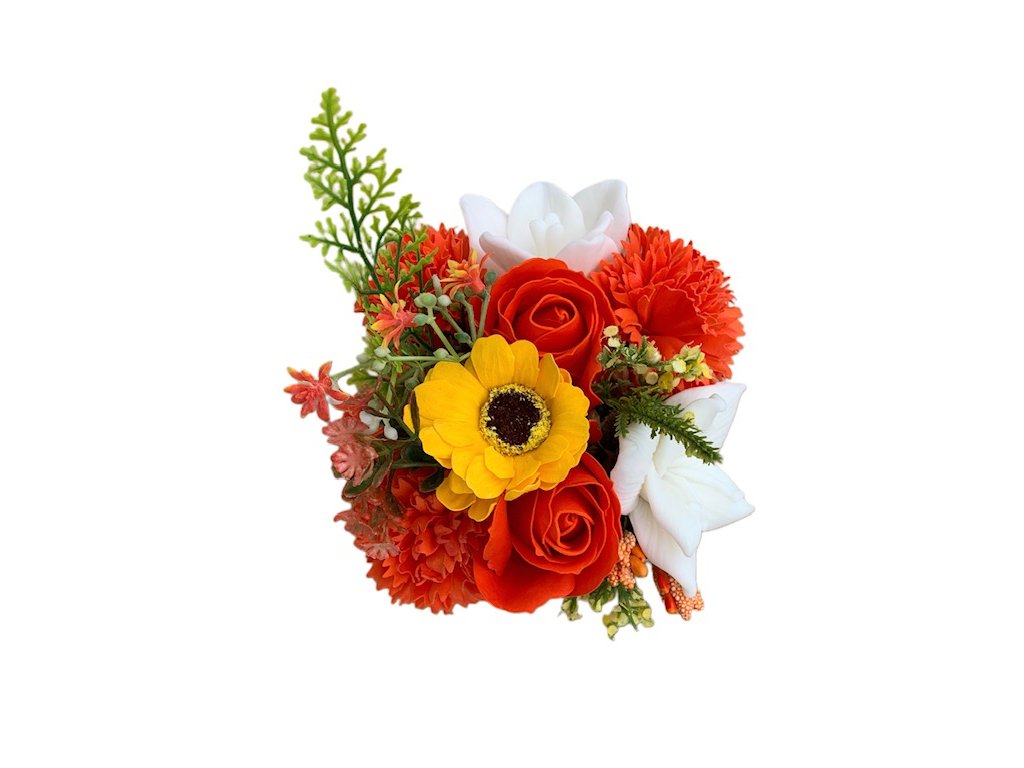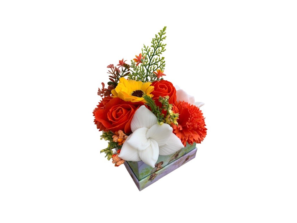Dekorace – Mýdlová kytice v dárkovém miniboxu Orangina
