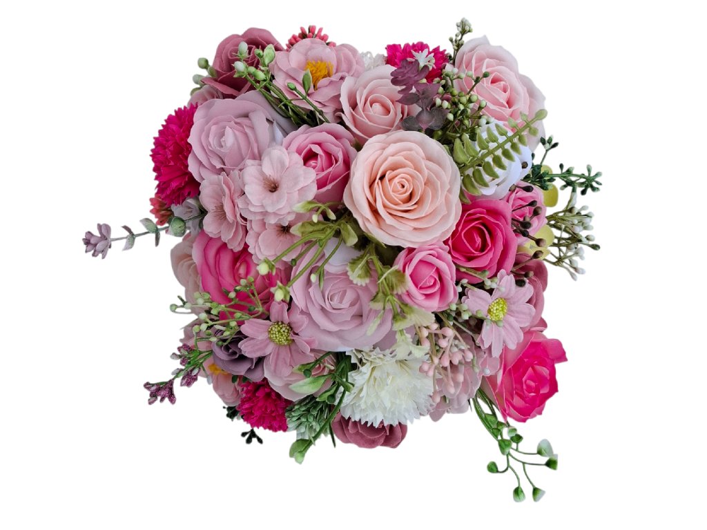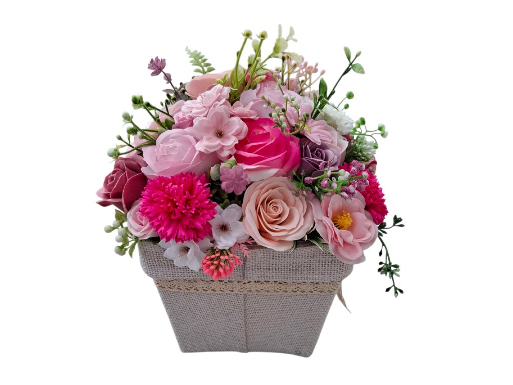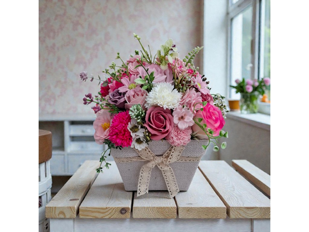 Originální dekorace i dárek. Kombinace mýdlových květů, zelených doplňků a elegantního obalu vynikne v každém interiéru. Je trvanlivá, hodí se výborně jako unisex dárek k narozeninám, svátku, výročí nebo svatbě.