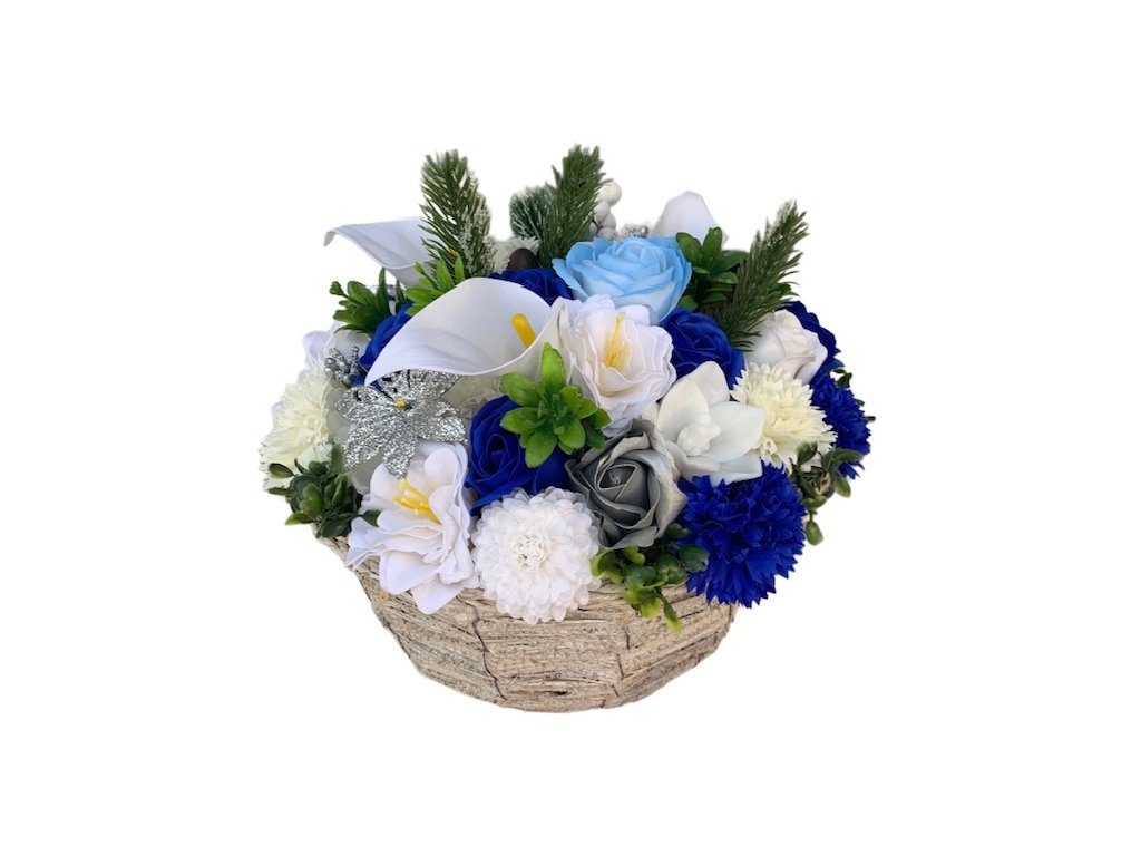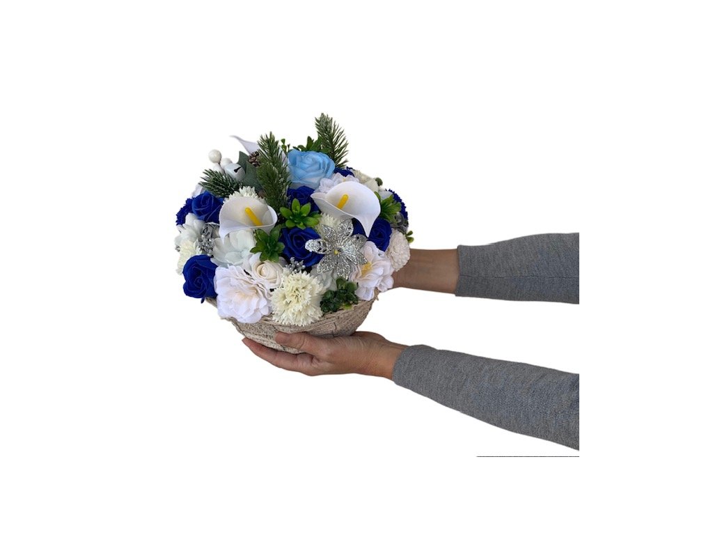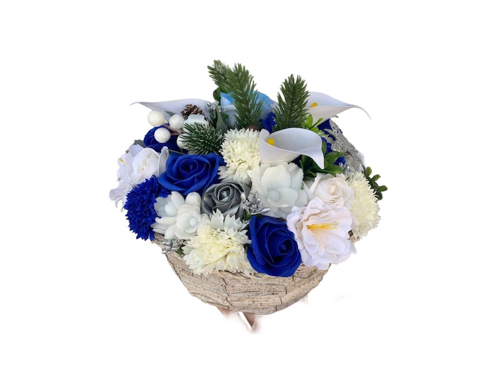 Elegantní mýdlová kytice v modro-bílém vánočním tónu je krásnou dekorací i originálním dárkem pro vaše blízké. Květiny z tuhého mýdla jsou aranžovány v proutěném obalu o průměru 23 cm a doplněny o umělou zeleň.