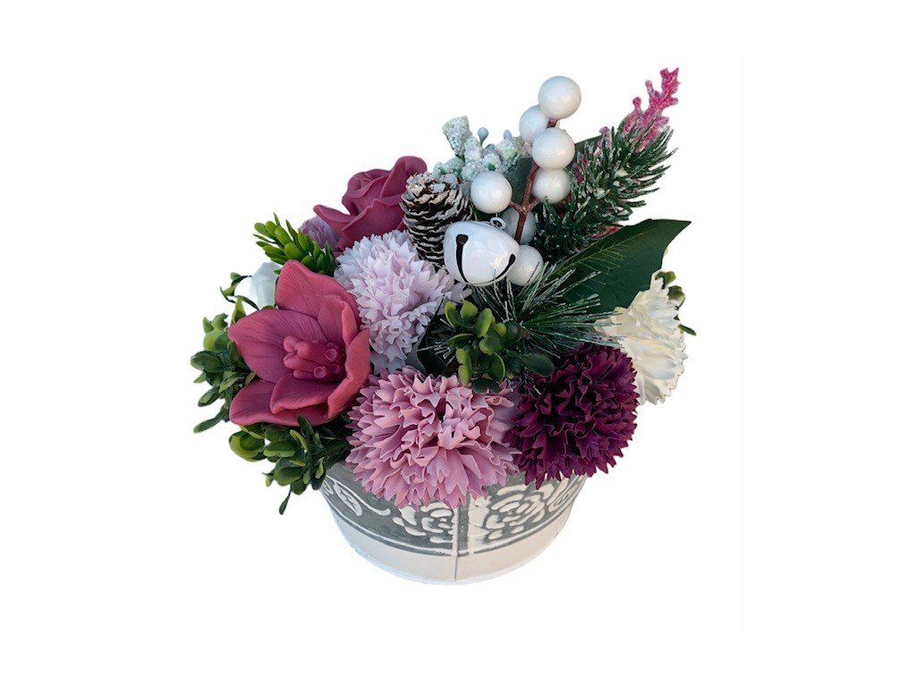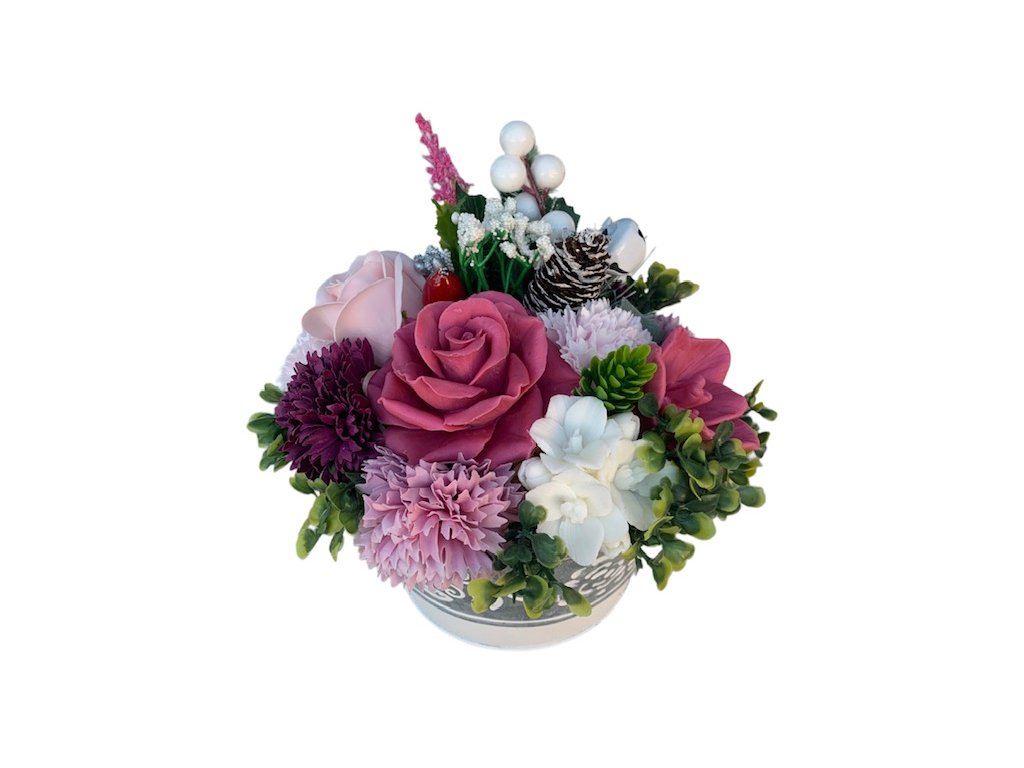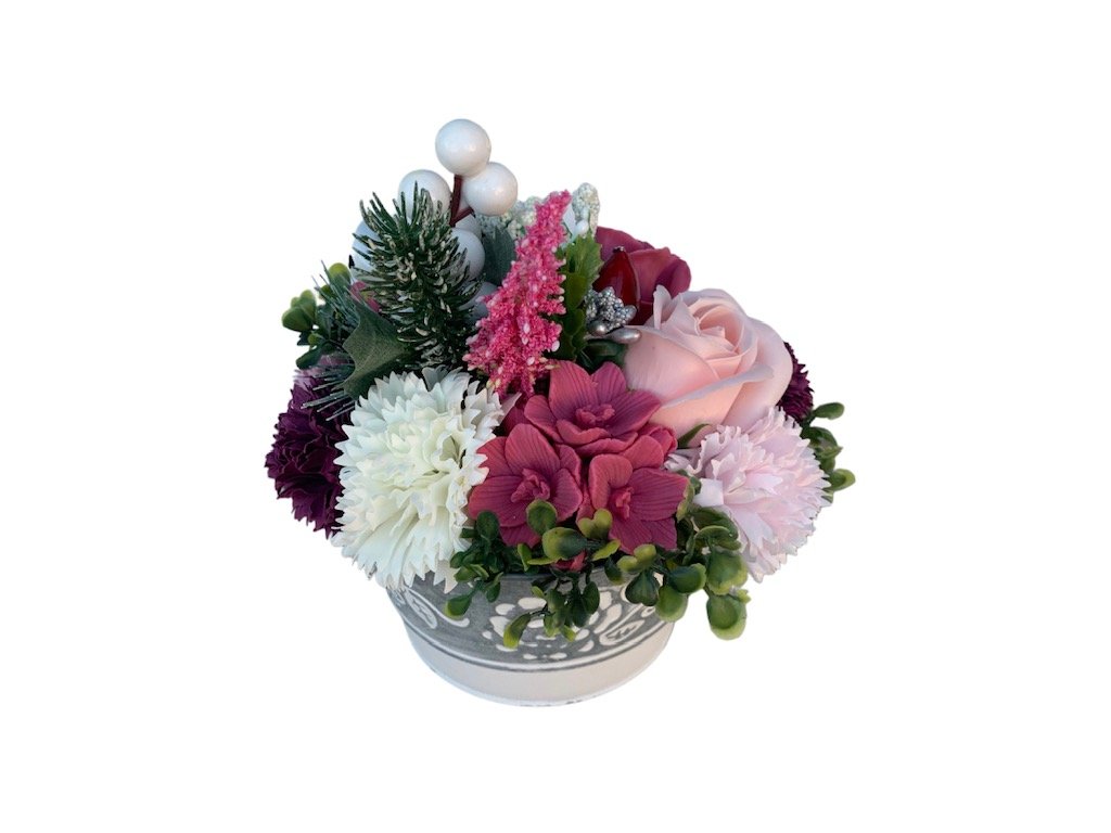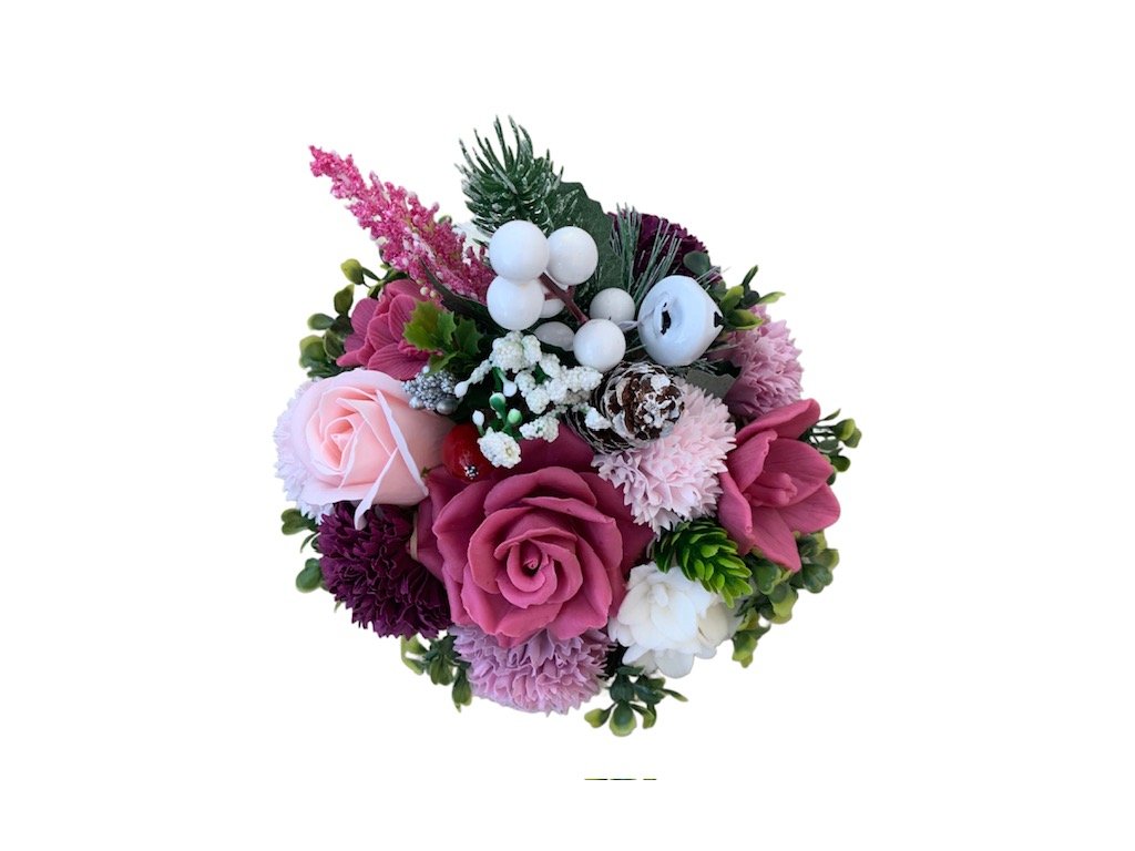 Elegantní mýdlová kytice v růžovém vánočním tónu je nádhernou ozdobou i originálním dárkem pro vaše blízké. Mýdlové květy jsou aranžovány v kovovém obalu o průměru 15 cm a doplněny o umělou zeleň.