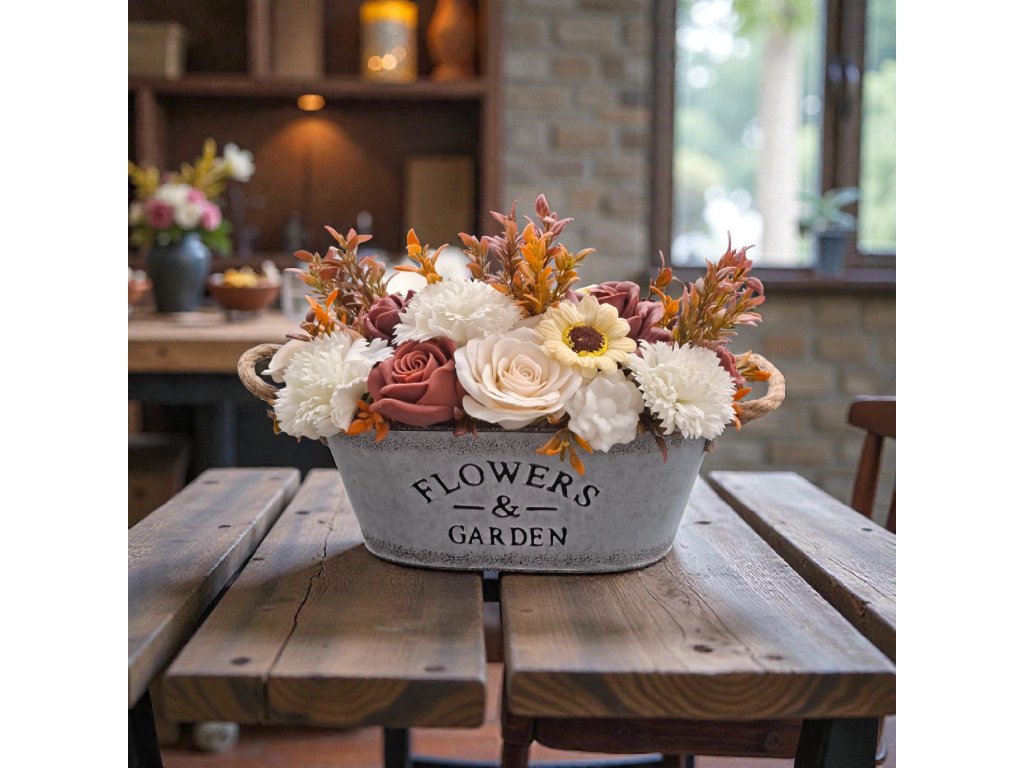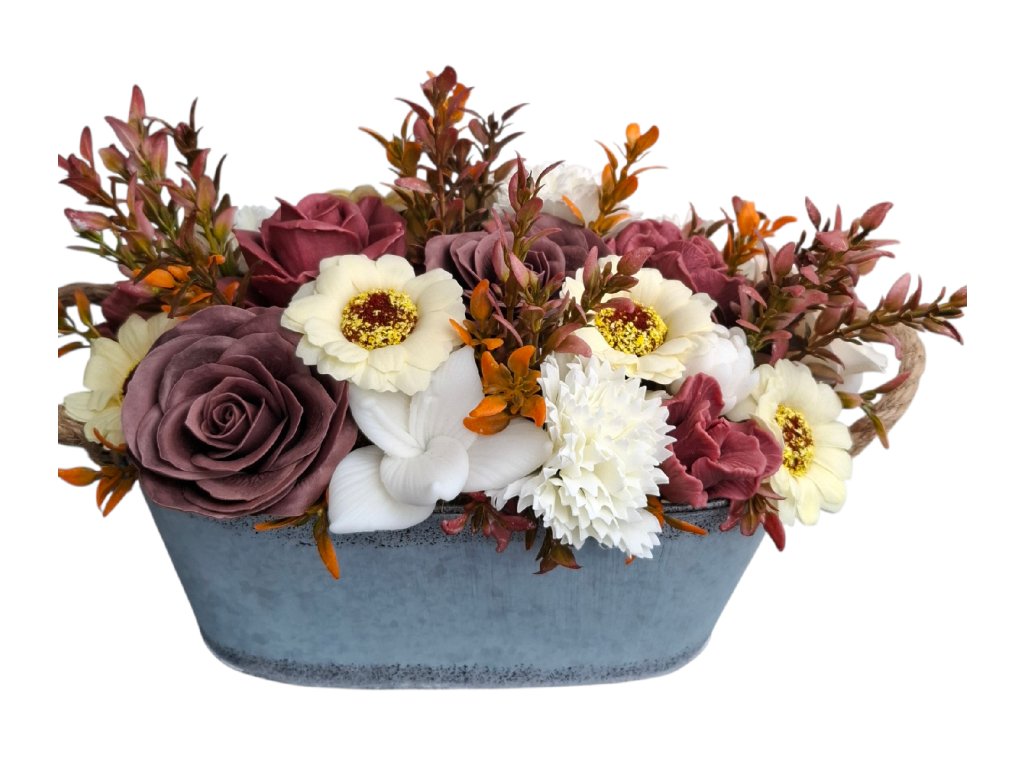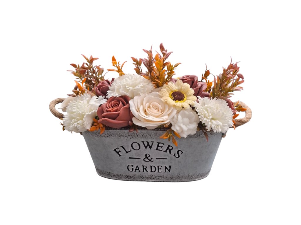 Aranžováno v truhlíku, celková šířka 28cm, celková výška 19cm
