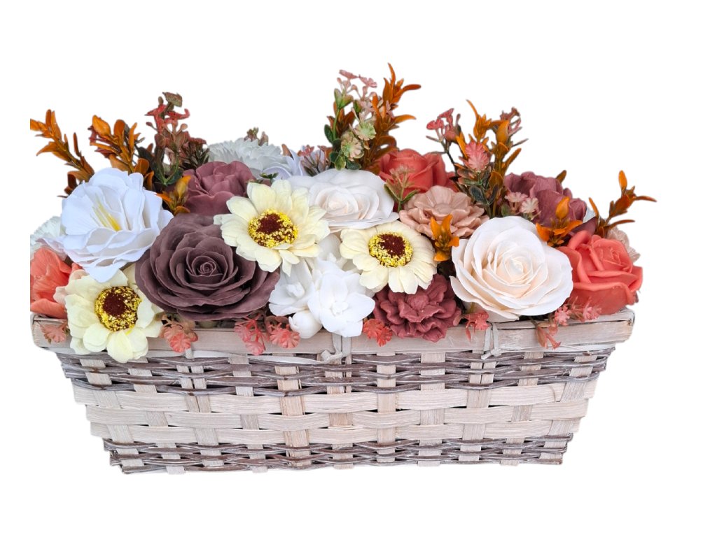 Aranžováno v truhlíku, celková šířka 32cm, celková výška 21cm