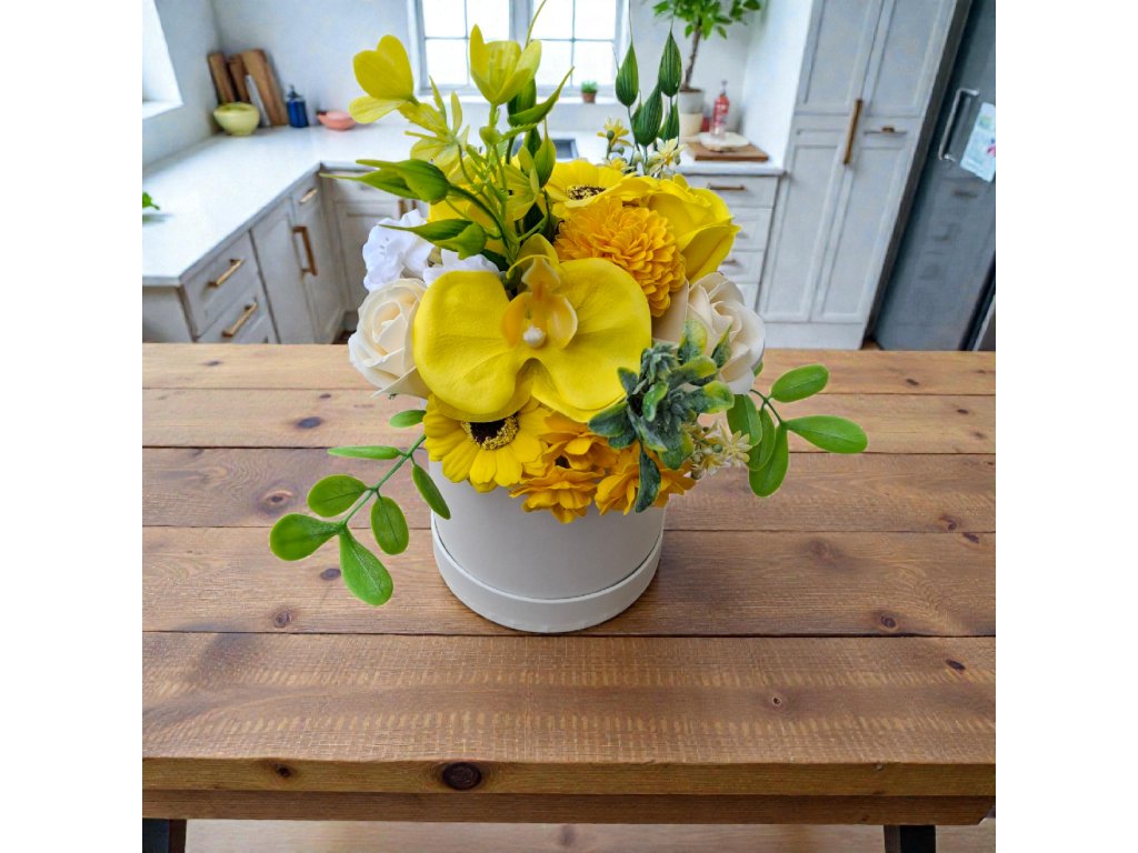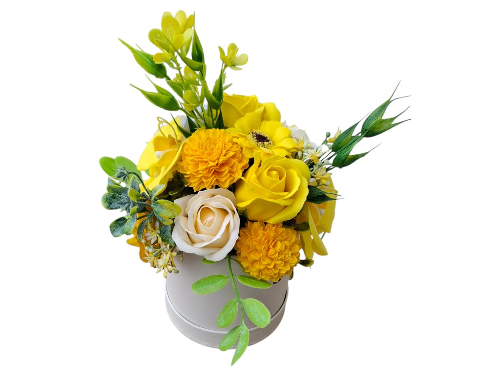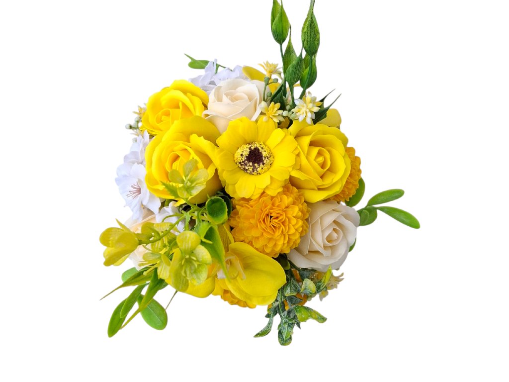 Elegantní Mýdlová kytice Žlutá perla v papírovém obalu. Krásná a trvanlivá dekorace, ideální jako dárek pro ženu i muže.
