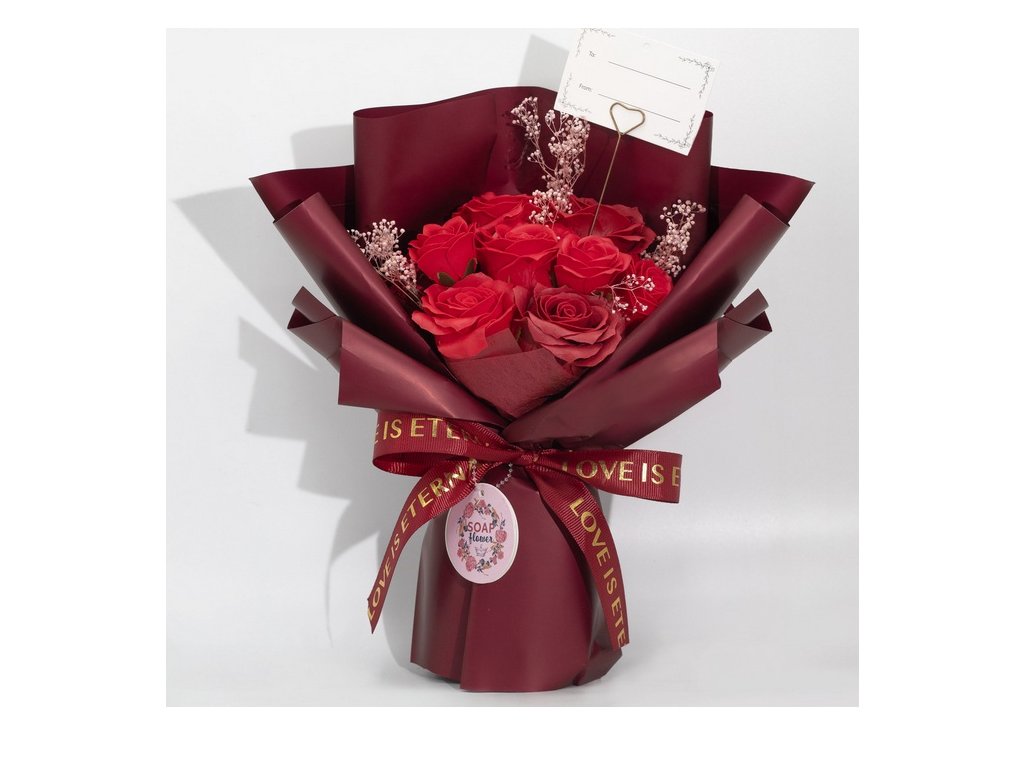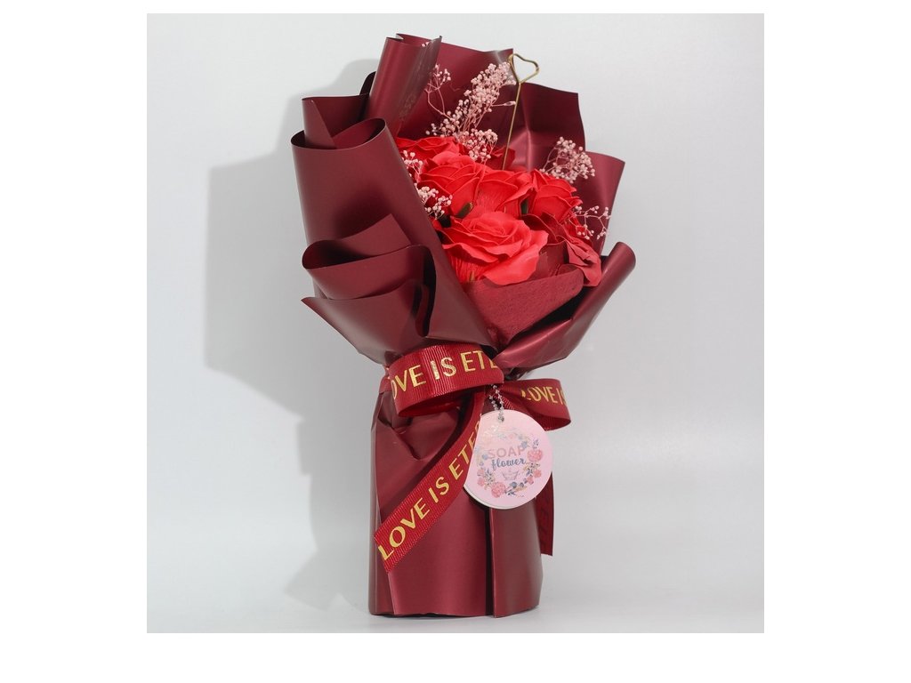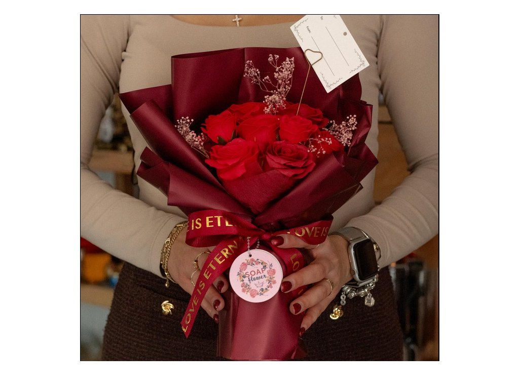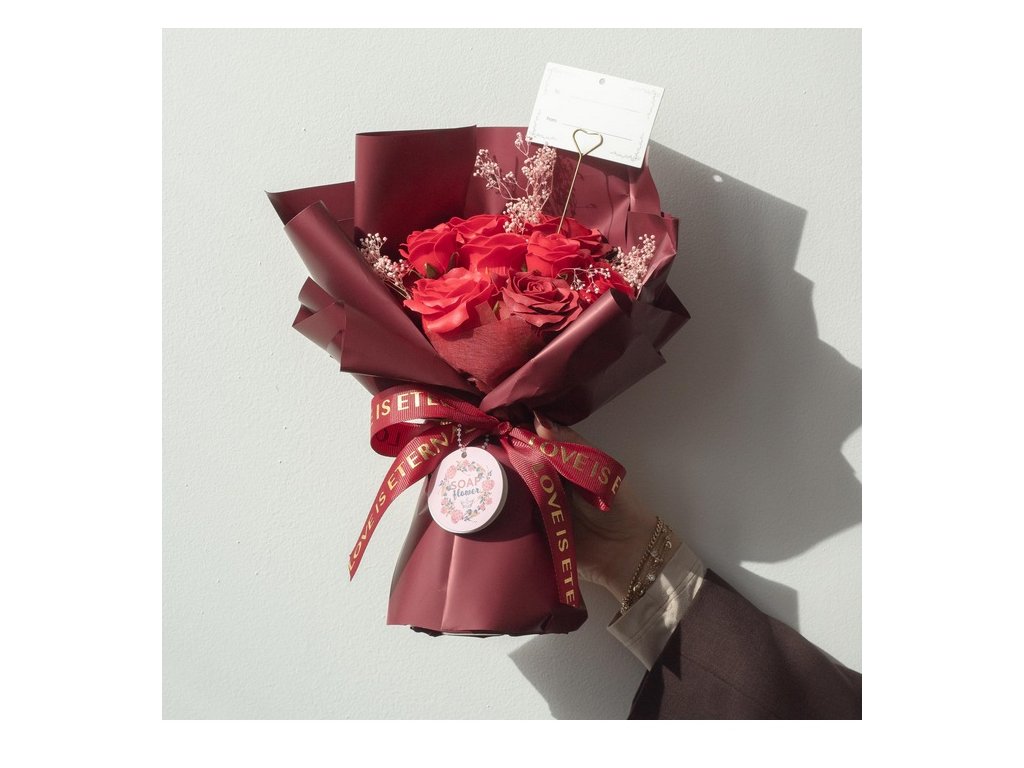 Luxusní kytice mýdlových růží, která vypadá jako čerstvě uvázaná, ale její krása nekončí po pár dnech. Okvětní lístky jsou vytvořené z jemného mýdlového materiálu, takže kytice působí realisticky a zároveň zůstává dlouhodobě dekorativní – bez zalévání a bez starostí.