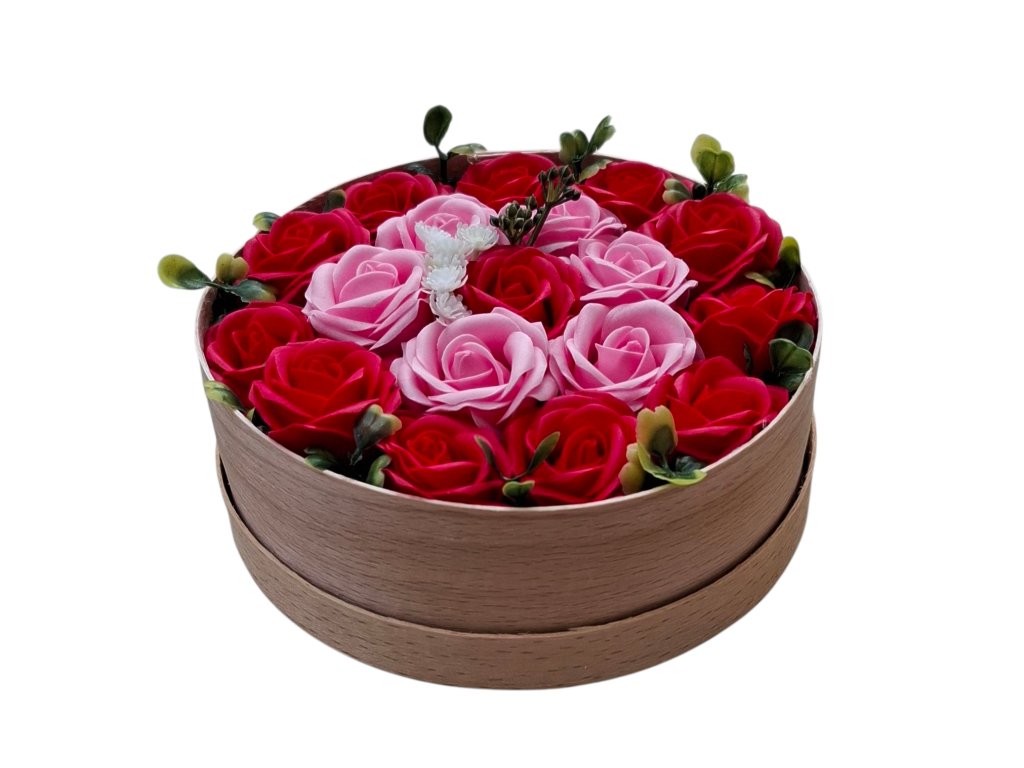 Mýdlové květy volně vložené do boxu z dřevěné dýhy průměr 14,5cm.