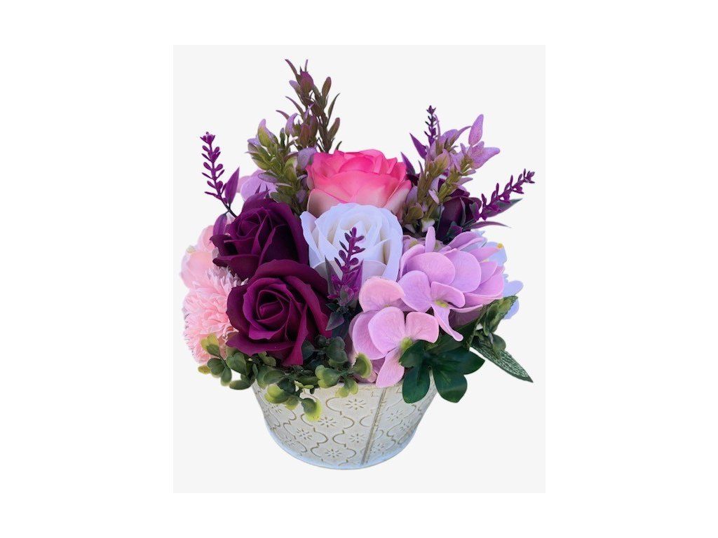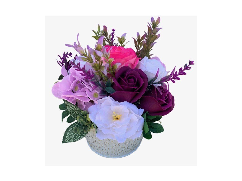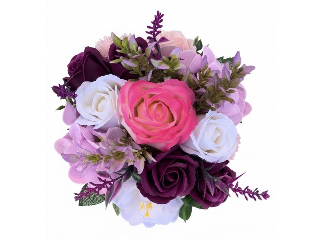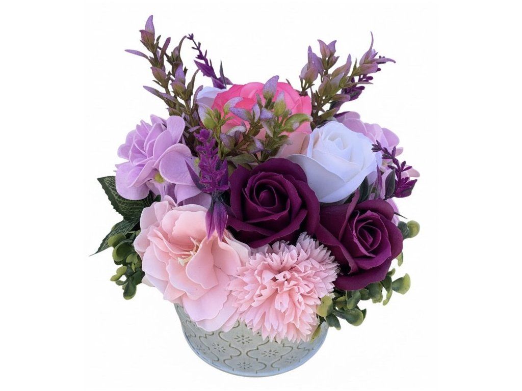 Romantická mýdlová kytice Emma v něžných fialových, bordo a bílých tónech krásně rozzáří každý interiér.